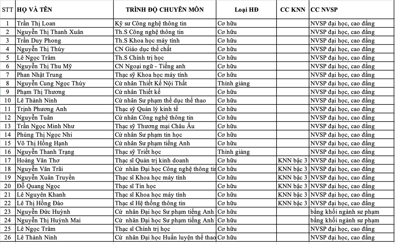 Danh sách giảng viên tham gia giảng dạy các ngành trình độ Cao đẳng, Trung cấp, Sơ cấp tại các cơ sở của FPT Polytechnic